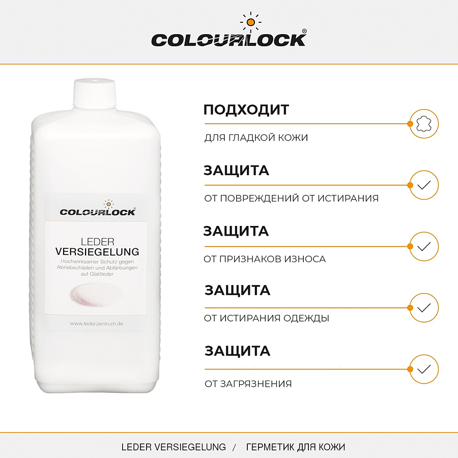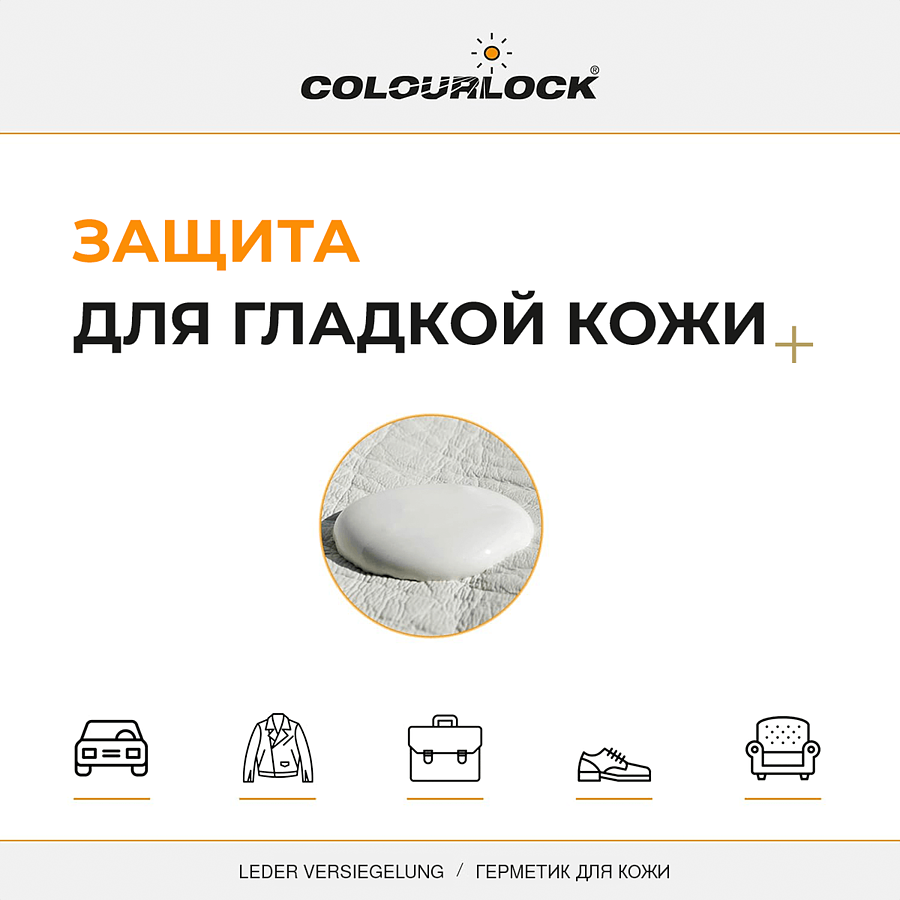 COLOURLOCK LEDER VERSIEGELUNG - герметик для новой окрашенной гладкой кожи с полуглянцевой или матовой поверхностью. Защищает новую кожу от пятен и износа. Предназначен для новой кожаной отделки транспортных средств, кожаной мебели, в том числе кожи Long Life, Cool и SRT (SunReflective Technology) в течение первых 3 лет