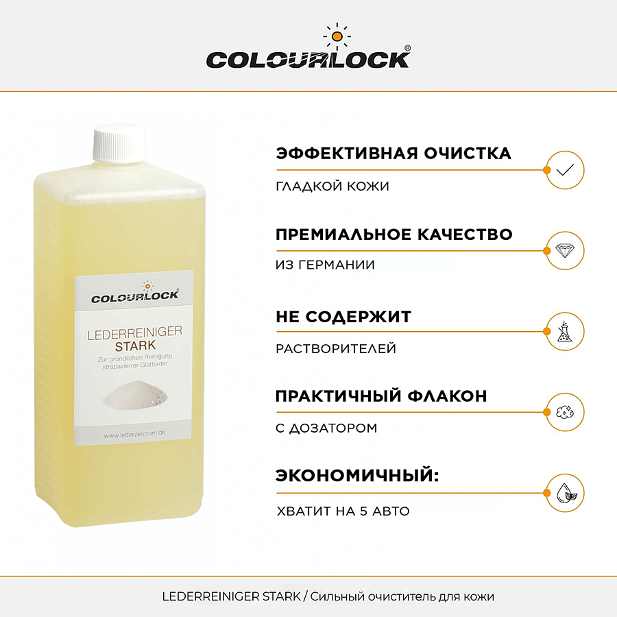 COLOURLOCK LEDERREINIGER STARK - средство для агрессивной очистки гладкой и текстурированной кожи от стойких и застарелых загрязнений. Канистра 1 л. Предназначен для экстремальной очистки кожаных поверхностей (автомобили, обивка мебели, сумки, чемоданы, одежда).
