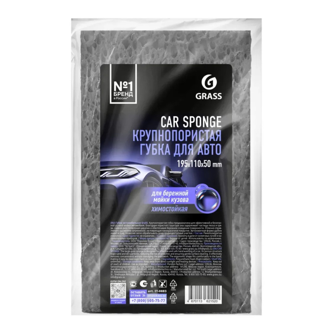 GRASS CAR SPONGE - серая автомобильная крупнопористая губка. Предназначена для мытья различных видов автотранспорта. Эффективно очищает въевшуюся грязь, сажу, масляные пятна, соль и другие тяжелые эксплуатационные загрязнения, обеспечивает полирующий эффект.