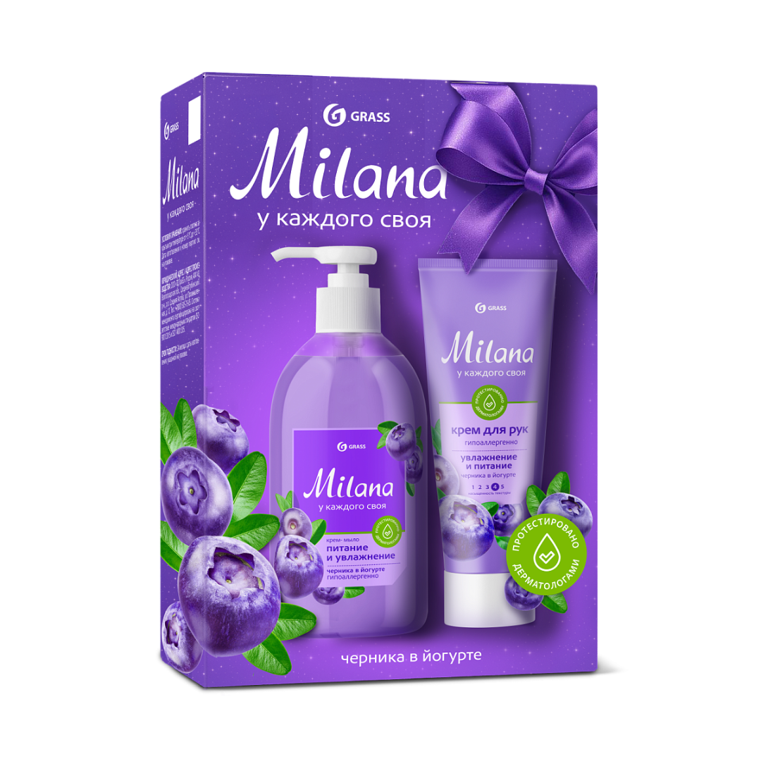 GRASS 300576 - подарочный набор "Milana черника в йогурте". Включает в свой состав жидкое крем-мыло во флаконе с дозатором объемом 300 мл и крем для рук в тюбике 80 мл.