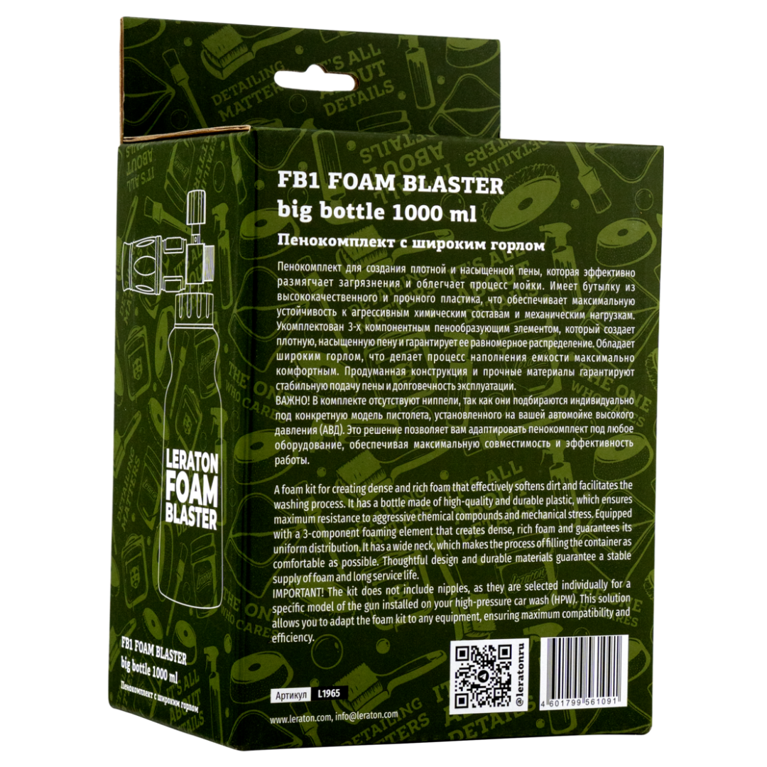 LERATON FB1 FOAM BLASTER - профессиональная пенная насадка для создания плотной и насыщенной пены, которая эффективно размягчает загрязнения и облегчает процесс мойки.