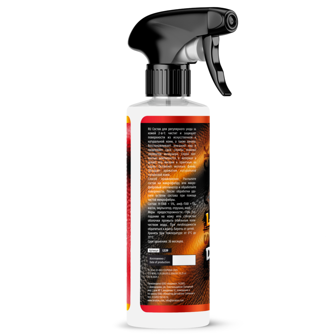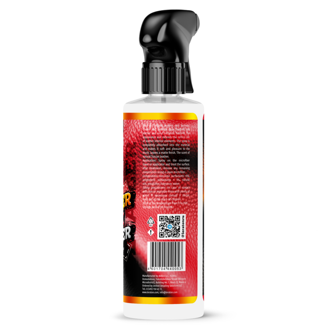 LERATON LQ LEATHER QUICK DETAILER - очиститель и кондиционер для кожи 2 в 1. Чистит, защищает, восстанавливает и продлевает срок службы поверхностей из натуральной и искусственной кожи, а также винила. Спрей полностью впитывается в материал и оставляет его мягким и приятным на ощупь. Очиститель и кондиционер для кожи делает кожаные поверхности гладкими, матовыми и защищенными, придавая им ненавязчивый аромат.