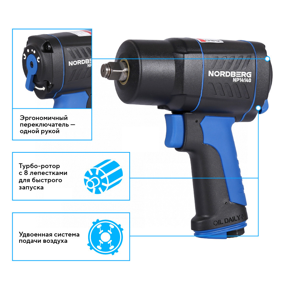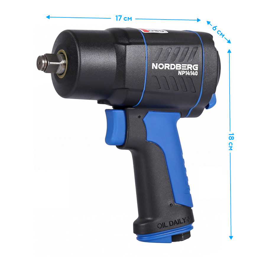 NORDBERG NP14140 - ударный пневмогайковёрт 1550 Нм с посадочным квадратом 1/2". Предназначен для откручивания и закручивания резьбовых соединений при ремонте и обслуживании автомобилей.