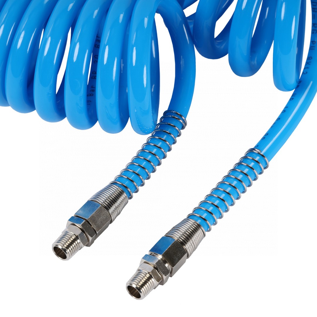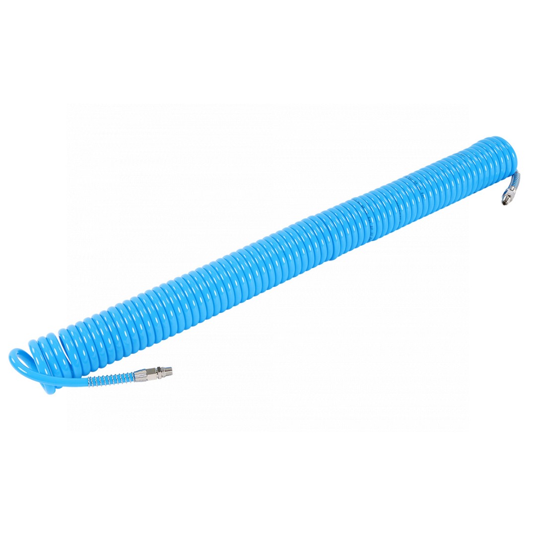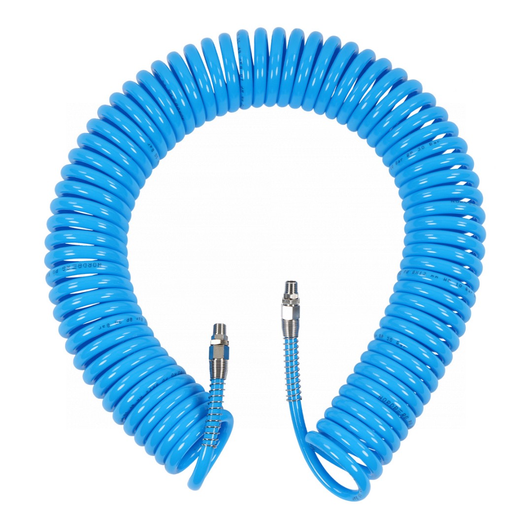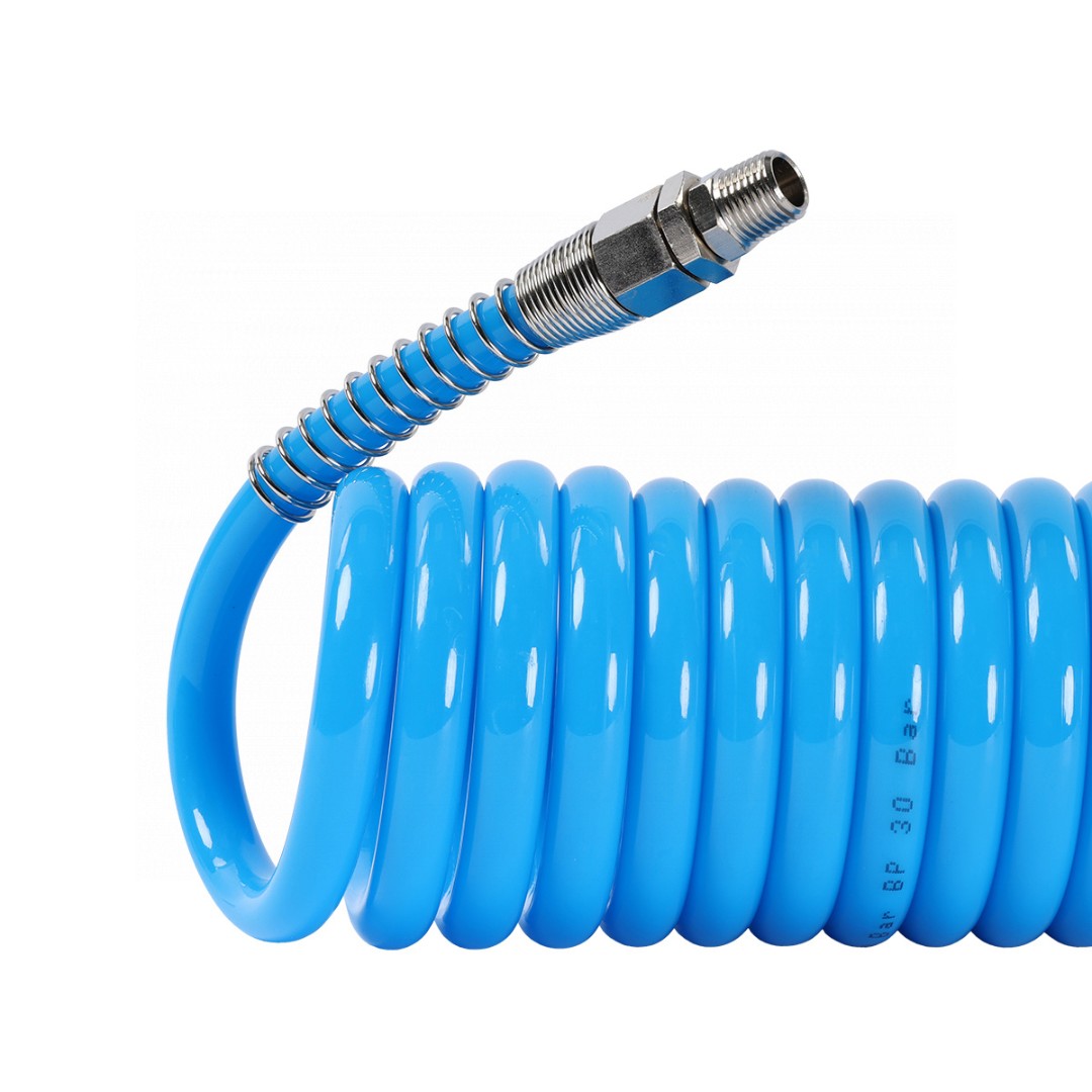 Предназначен для подачи воздуха от компрессора к пневмоинструменту. Спиральная форма шланга делает работу с пневмоинструментом более комфортной. Оснащен с двух сторон вращающимися фитингами с наружной конусной резьбой BSPT 1/4" и металлической пружинной защитой для защиты от перегиба.