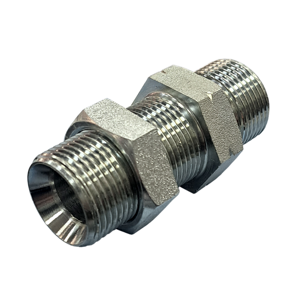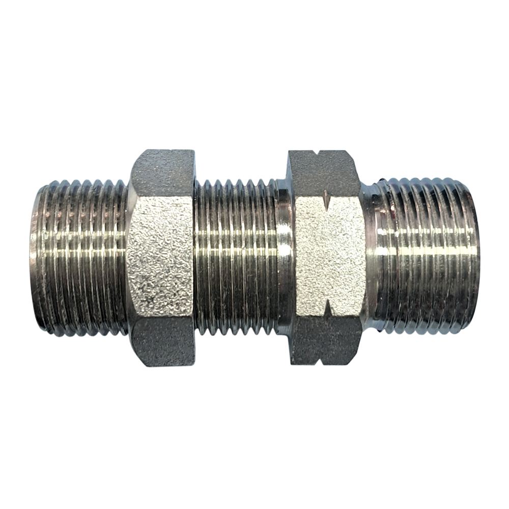 1B-12LN - резьбовой переборочный переходник формата BSP для гидравлических систем с рабочим давлением до 350 бар. Имеет удлиненную резьбовую часть с одной стороны и свободную фиксирующую гайку.