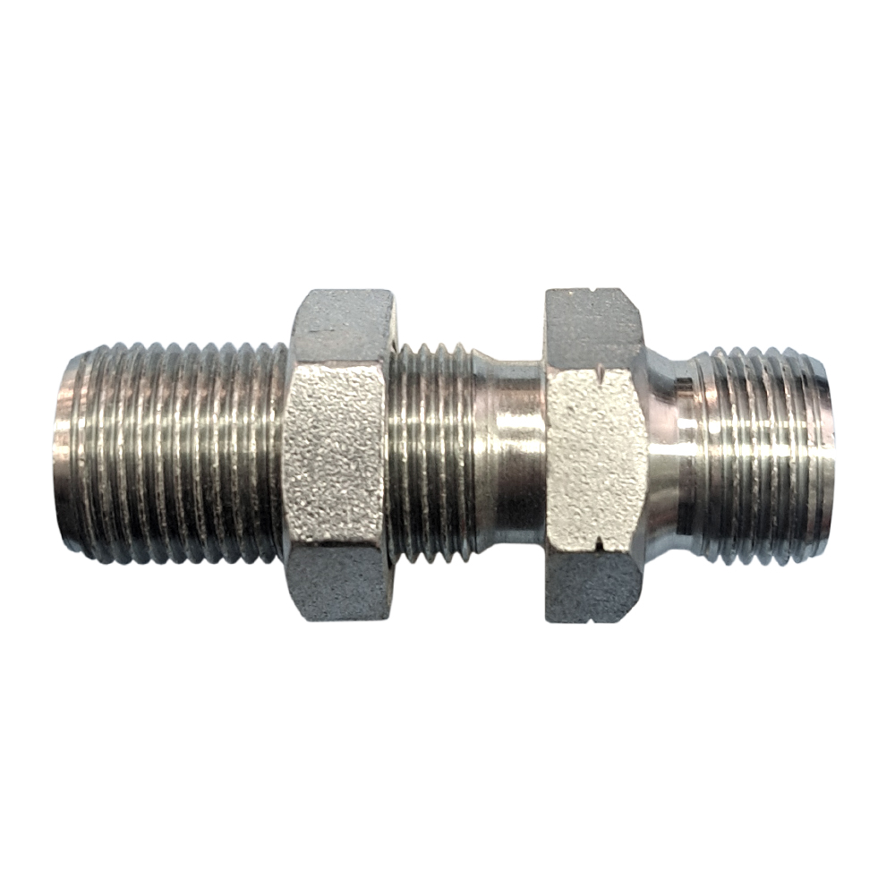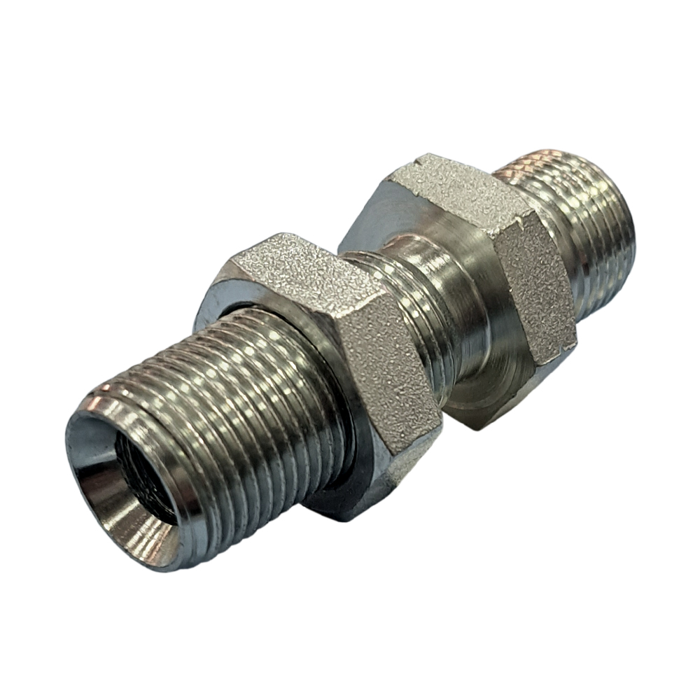 1B-06LN - резьбовой переборочный переходник формата BSP для гидравлических систем с рабочим давлением до 350 бар. Имеет удлиненную резьбовую часть с одной стороны и свободную фиксирующую гайку.