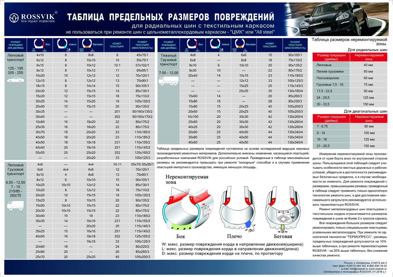 Для подбора необходимой пластыря используйте соответствующую таблицу (доступна в фотогалерее). Для определения необходимого размера ремонтного материала необходимо учитывать класс шины, а также место и размер повреждения.