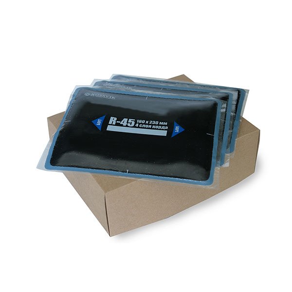 ROSSVIK R-45 - четырехслойные кордовые пластыри (серия R) 180x230 мм, предназначенные для ремонта всех типов радиальных бескамерных и камерных автошин грузового и пассажирского транспорта, сельскохозяйственной и карьерной техники. Обеспечивают надежный и долговечный ремонт в любом ремонтопригодном месте автошины. Вулканизируются как "горячим", так и "холодным" способами.