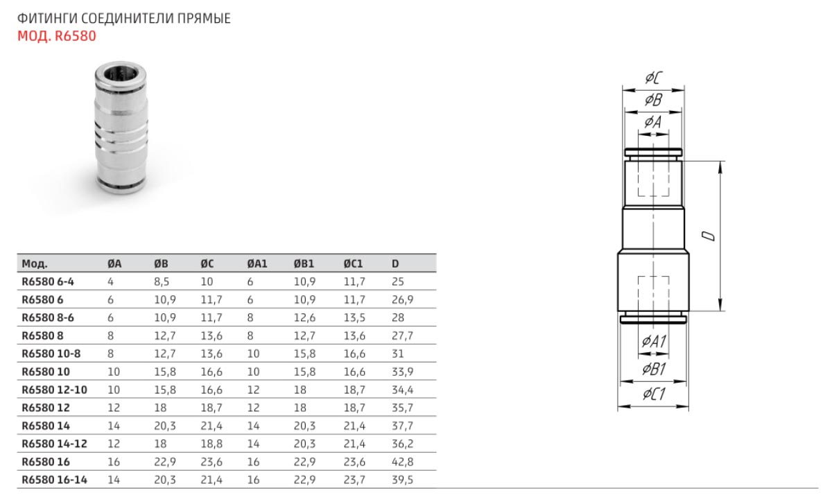 - Диаметры трубок: Ø 4, 5, 6, 8, 10, 12, 14, 16