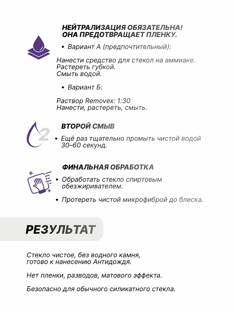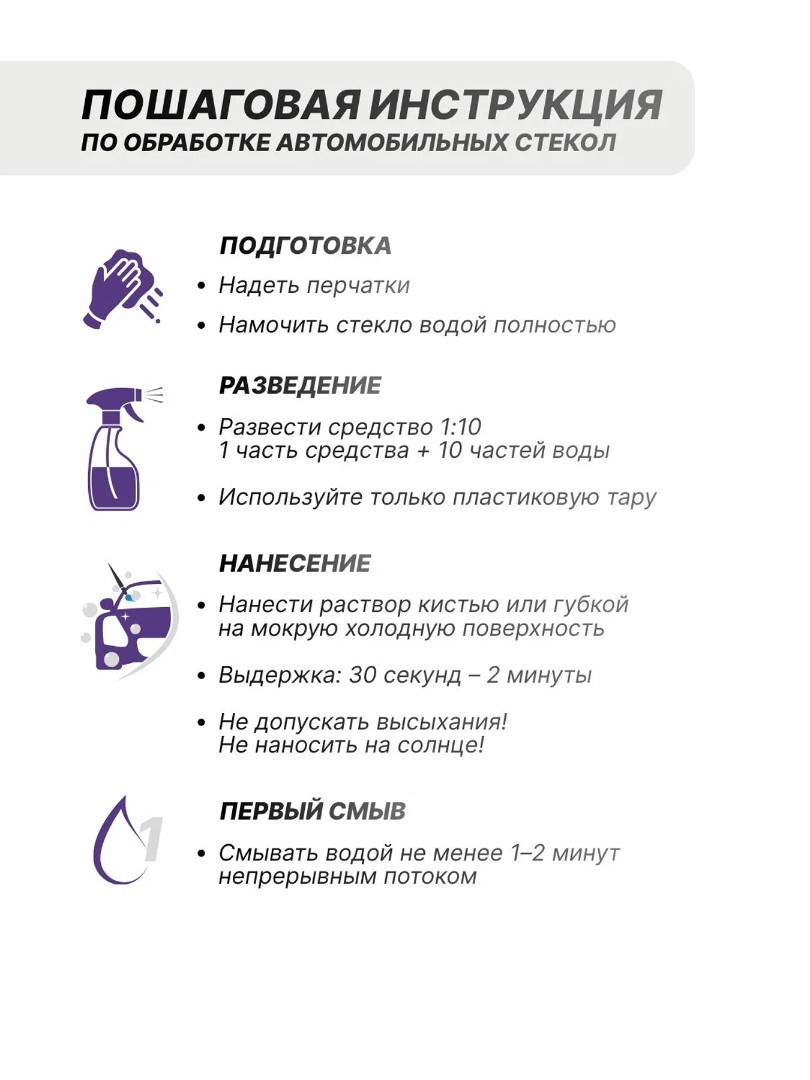 Используйте защитные перчатки и очки при работе с продуктом. Избегайте контакта с кожей и глазами. Храните в недоступном для детей и животных месте. Не допускайте попадания на чувствительные поверхности без предварительного тестирования.