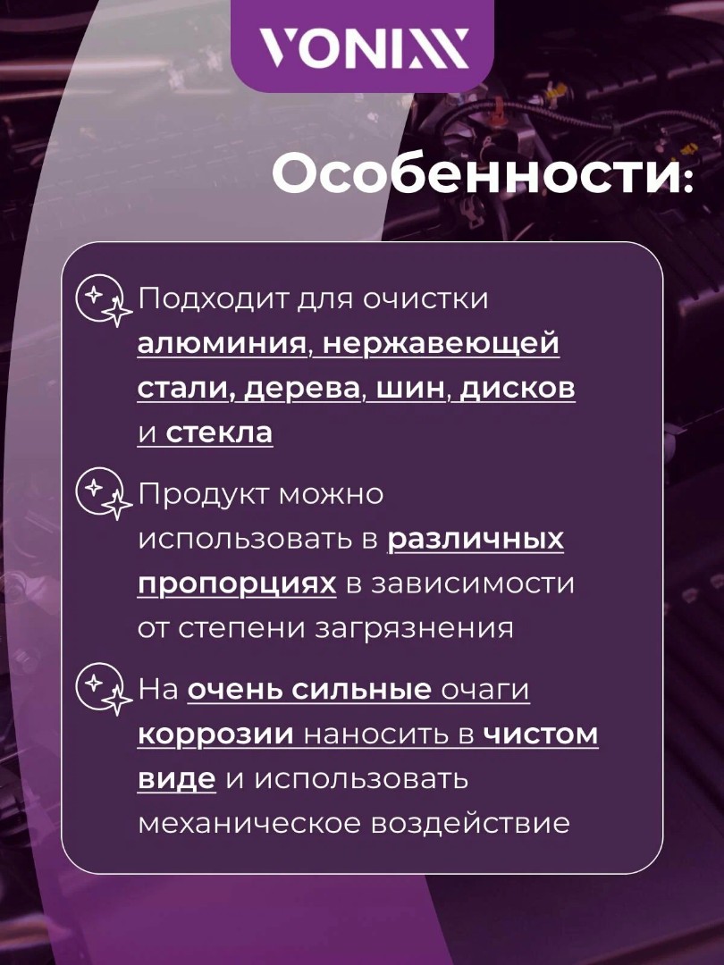 ЛКП, пластик, резинки, ППФ, хром — при разведении 1:10 работает лучше, чем большинство кислотных шампуней; контролируйте процесс и смывайте обильно.
