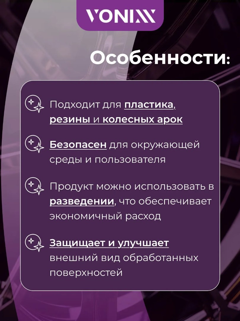 VONIXX VINTEX ECOBLACK - финишный состав для обработки колесных арок. Экологически безопасный, водорастворимый состав, специально разработанный для придания блеска и защиты колесных арок, пластиковых и резиновых элементов автомобиля.